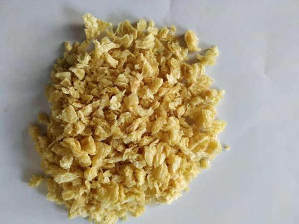 組織蛋白有粒狀、塊狀、片狀、絲狀等不同形態(tài),呈不同深淺的黃褐色,其網(wǎng)狀結(jié)構(gòu)成定向排列,形成具彈性、韌性的纖維束或積層,使在食用時有類似肉食肌肉組織的咬勁。典型的組織蛋白含蛋白質(zhì)60%左右。可用作仿肉制品的肌纖維材料。